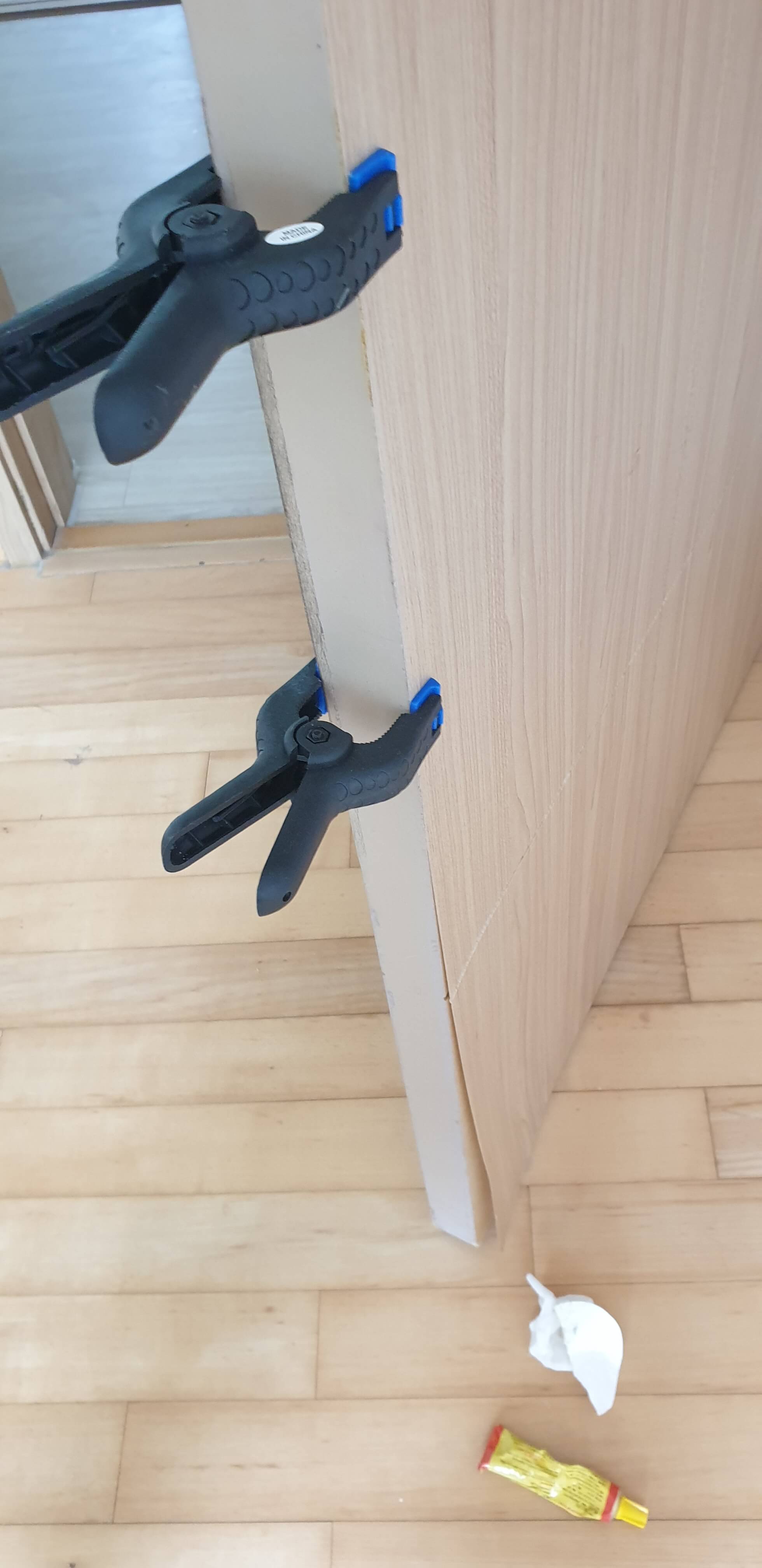 역시 다이소에는 다 있었다. 오공본드를 준비했고, 시트나 필름과 문짝에 잘 붙도록 커다란 집게가 필요했다. 일명 클램프라고 했다. 클램프는 목공작업할 때 목조를 고정해야 할 상황에서 쓰는 목공 공구이다.