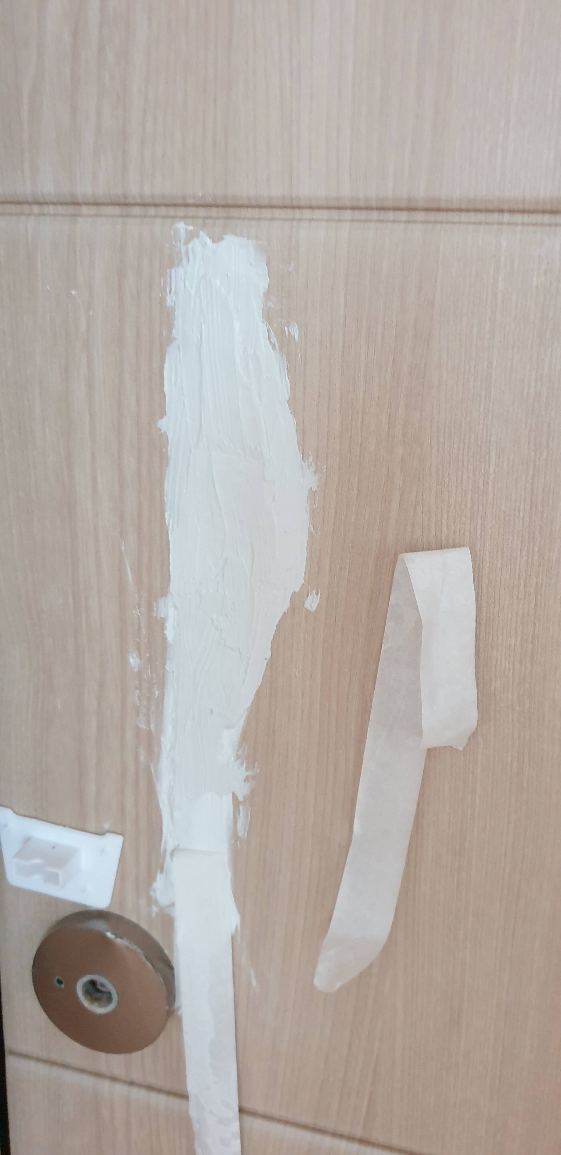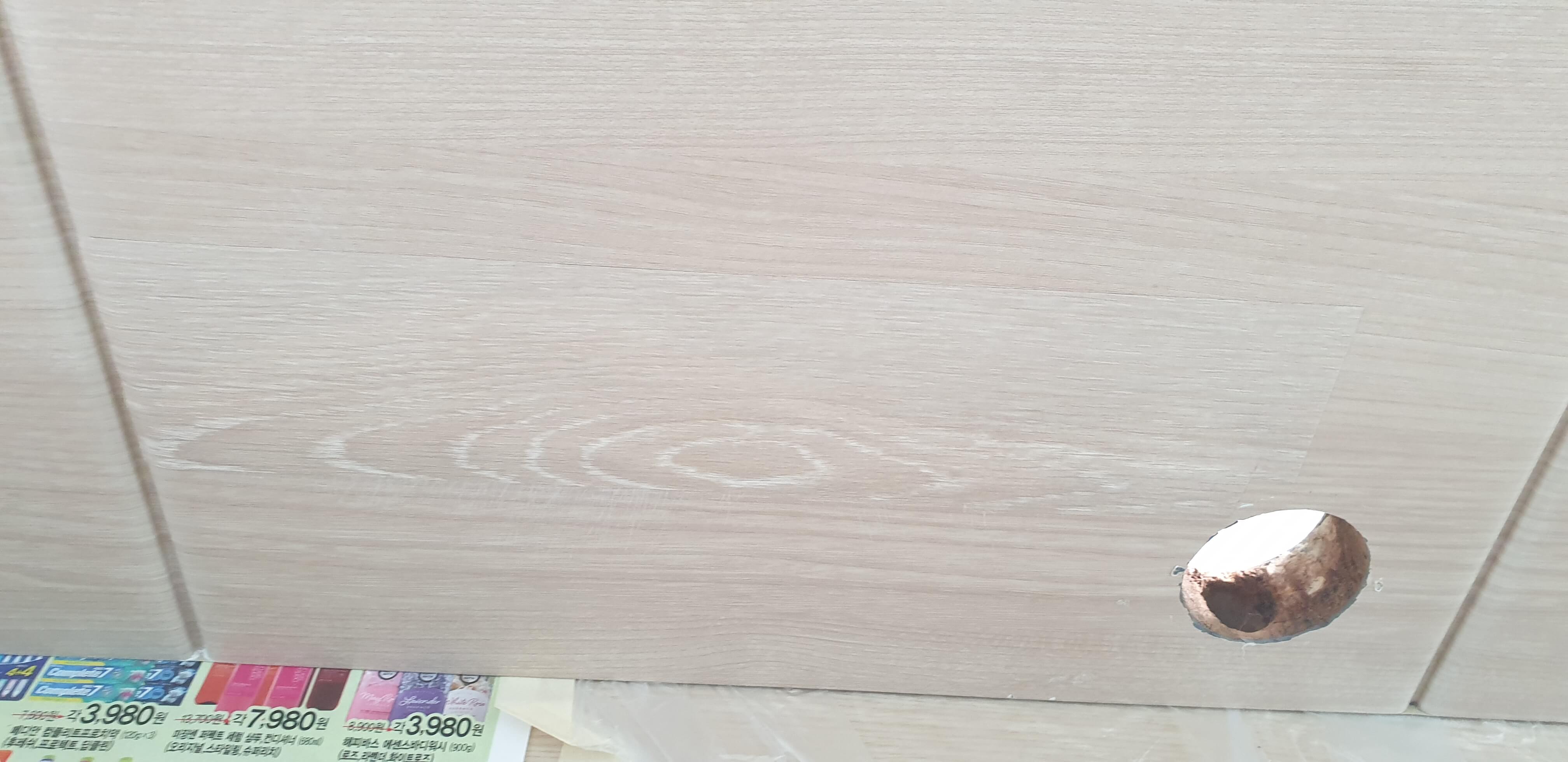 정말 감쪽같이 붙어서 애초에 구멍이 나 있었나 실을 정도로 구별할 수 없었다. 저 옆에 동그란 구멍은 문 손잡이 구멍이라서 애초에 다른 구멍입니다. 문 손잡이가 녹슬어서 교체하였습니다.
