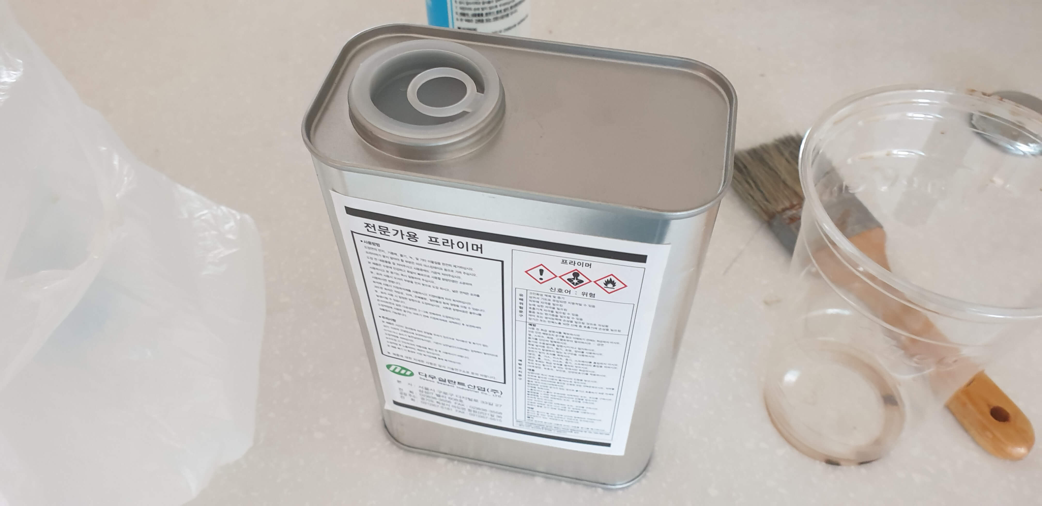 프라이머는 유일하게 다이소에서 판매하지 않았다. 이커너스를 검색해서 1만 원 이하 대에 구입할 수 있었다. 프라이머는 실리콘 위에 덧붙이거나, 시멘트 부위에 실리콘이 붙지 않기 때문에 용이하게 점착할 때 사용되며 일종의 본드 역할을 한다. 양이 많아서 다 사용하지 않으니, 일부만 사용하게 되었다. 하여튼 이 프라이머로 실리콘 위에 덧방을 하든, 시멘트에 바르든 해야 해서 프라이머로 도포하였다.