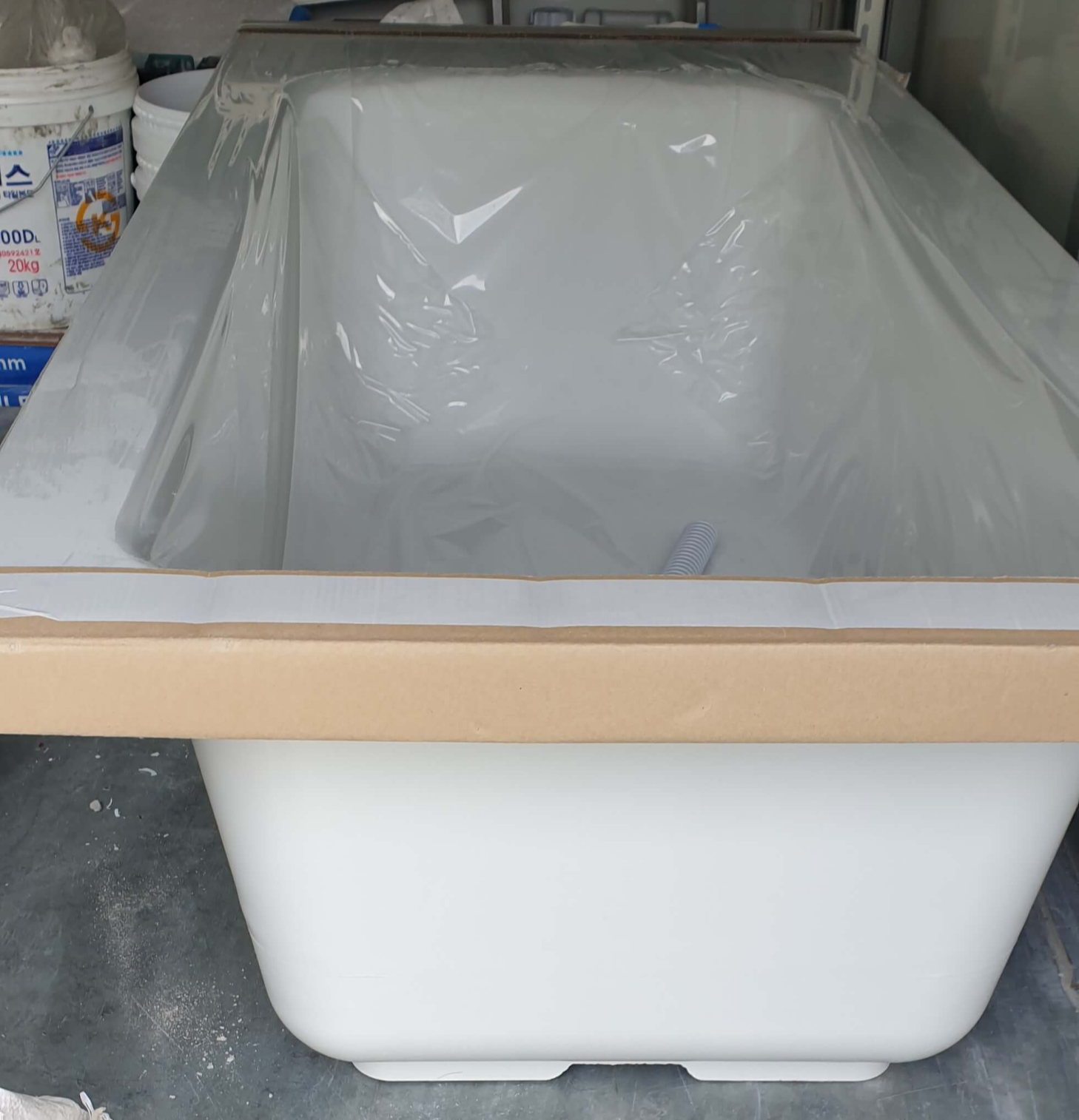 새 욕조 대령이요! 새 욕조를 보니 기분이 좋았다. 욕실에 설치될 새 욕조였다. 깔끔하고 깨끗했다. 아파트 바깥에서 새로 재단을 해서 들여왔다.