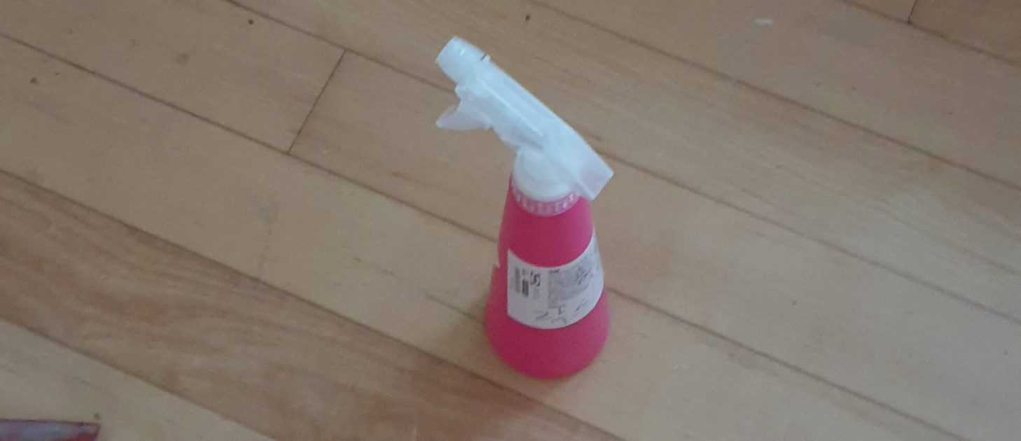 세제 희석 시킨 물을 분무기에 담는다. 바닥에 칙칙 뿌린다. 흘러내릴 정도로 많이 뿌리지 말고 분사하는 수준으로 뿌려준다. 세제 희석 시킨 물은 기름때나 오염까지 제거시킨다.